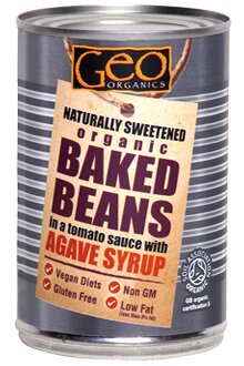 Naturally sweetened Organic baked beans in a tomato sauce with agave syrup. |